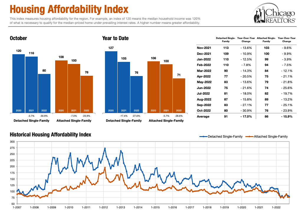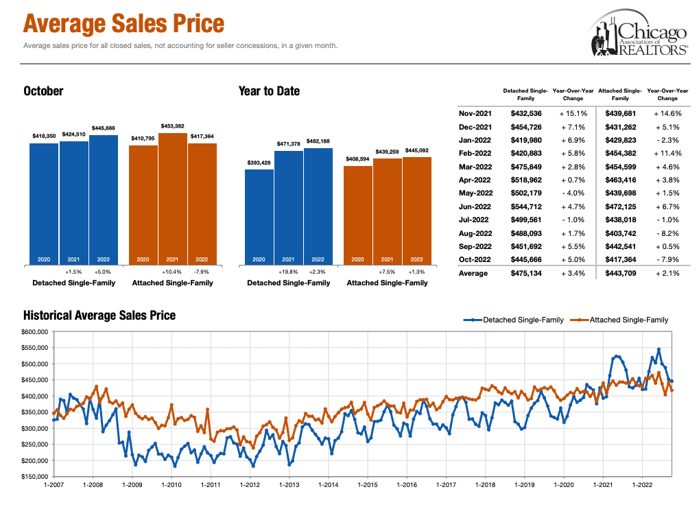 We are starting to see signs of prices coming down in most of Chicago’s housing markets. However, this is primarily due to an uncharacteristically strong fall market in 2021. Average attached single home prices are still up 2.1% on the year and average detached singles are up 3.4% on the year. Detached SFH’s are holding up much better than I had expected, showing strong gains in Aug-Oct. Attached singles, however, have shown weakness over the same period.